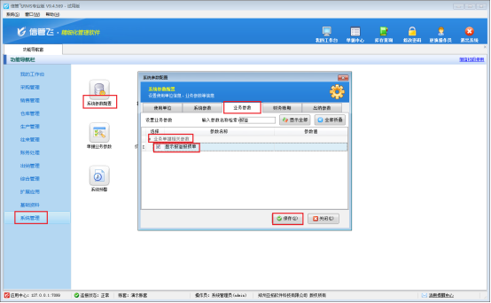 功能導航欄點擊“系統管理”-》“系統參數配置”,進入系統參數配置界面,業務參數界面業務單據相關參數下勾選參數“顯示報溢報損單”,勾選之后點擊保存。