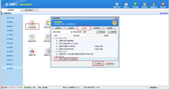 設置方法如下:點擊左側功能導航窗,“系統管理”—》“系統參數配置”—》“業務參數”,進入“業務參數”配置界面,在特殊功能參數下打勾啟用“采購入庫成本價不包括運費”參數,勾選之后后點擊“保存”按鈕進行保存,如圖所示: