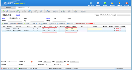 新開一個采購入庫單,新增商品,輸入運費,采購入庫成本價默認是包括運費的,如圖所示: