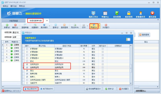 功能導航窗點擊“往來管理”—“收款結(jié)算單”進入收款結(jié)算單列表界面,工具欄打開“界面設計”,勾選顯示“出納憑證字”“出納憑證號”,并點擊向上移動至合適位置,保存界面設計,如下圖所示: