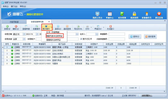界面設計保存后在收款結(jié)算單列表界面顯示出“出納憑證字”和“出納憑證號”兩列,在工具欄更多操作下點擊“刷新列表中出納憑證”,刷新后在列表界面轉(zhuǎn)記過出納憑證的會顯示憑證字和憑證號,顯示空白的則未轉(zhuǎn)記過出納憑證,如下圖所示: