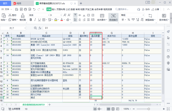 導出Excel文件后,修改表頭文本“庫存數量”為“盤點數量”,然后修改對應商品的盤點數量。如下圖所示:
