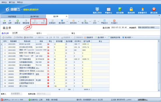 Excel文件中盤點數量修改完成,保存Excel并關閉界面,軟件中打開倉庫管理—盤點單,在盤點單列表上點擊“新增”按鈕,進入盤點單新增界面,選擇盤點倉庫“主倉庫”,點擊“從Excel導入明細”選擇Excel文件進行導入,導入后保存審核盤點單(盤點單審核前需要軟件中出入庫單據已審核完成),如下圖所示: