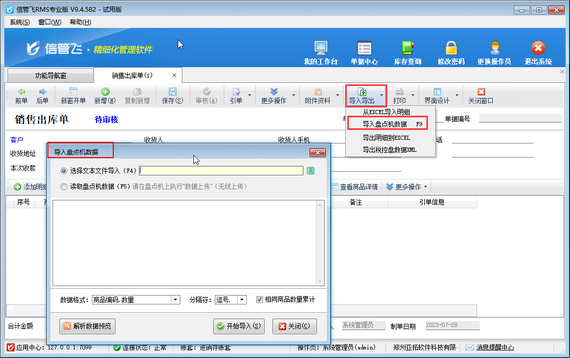 點(diǎn)擊“選擇文本文件導(dǎo)入”選項(xiàng),然后選擇盤(pán)點(diǎn)機(jī)數(shù)據(jù)文件。盤(pán)點(diǎn)機(jī)數(shù)據(jù)文件選擇好之后,根據(jù)已選的盤(pán)點(diǎn)機(jī)數(shù)據(jù)文件數(shù)據(jù)內(nèi)容設(shè)置數(shù)據(jù)格式及分隔符信息,然后點(diǎn)擊“開(kāi)始導(dǎo)入”按鈕導(dǎo)入數(shù)據(jù)即可。如下圖所示。