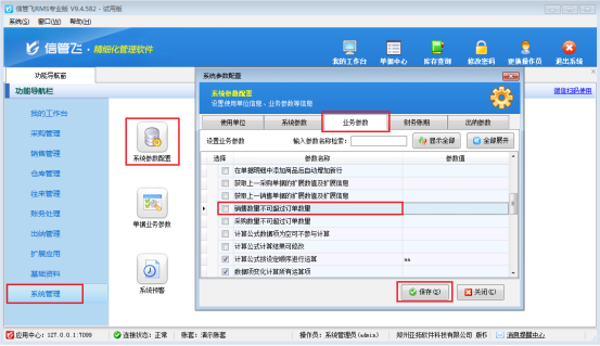 在功能導航窗點擊“系統管理”—》“系統參數配置”—》“業務參數”,即可進入到“業務參數”界面,取消勾選“銷售數量不可超過訂單數量”參數,然后點擊“保存”按鈕保存配置,如下圖所示。