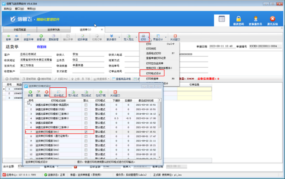 以送貨單軟件為例,打開一個(gè)送貨單,在單據(jù)界面工具欄點(diǎn)擊“打印”—》“打印格式設(shè)計(jì)”,在打開的打印格式設(shè)計(jì)窗口選擇需要調(diào)整的打印格式模板,然后點(diǎn)擊“設(shè)計(jì)格式”進(jìn)入模板設(shè)計(jì)器,如下圖所示。