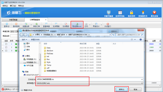查詢(xún)明細(xì)顯示后在訂單明細(xì)查詢(xún)界面,點(diǎn)擊“導(dǎo)出到EXCEL”,可以修改導(dǎo)出文件路徑和文件名稱(chēng)(默認(rèn)導(dǎo)出路徑是軟件安裝文件內(nèi)D:\信管飛軟件\信管飛送貨單軟件),將查詢(xún)結(jié)果導(dǎo)出到excel中,如圖所示: