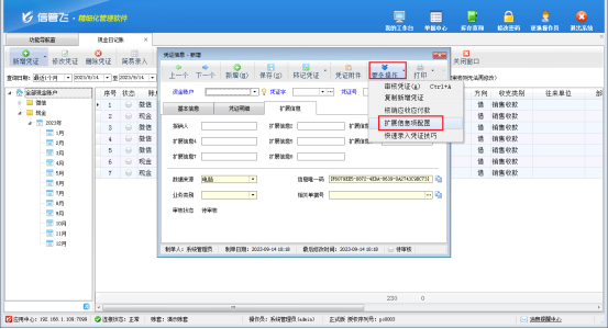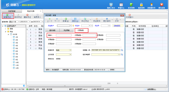 保存以后,在功能導航欄點擊“出納管理”進入日記賬界面,新增日記賬,在新增憑證窗口顯示“擴展信息”頁面可以錄入憑證的擴展信息,如下圖所示: