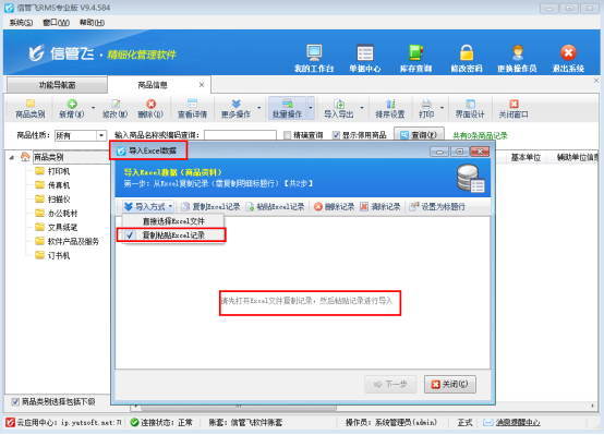在功能導(dǎo)航窗點(diǎn)擊基礎(chǔ)資料—》商品信息,點(diǎn)擊“導(dǎo)入導(dǎo)出”按鈕下的導(dǎo)入商品資料,彈出導(dǎo)入界面。支持兩種導(dǎo)入方式,默認(rèn)導(dǎo)入方式“復(fù)制粘貼Excel記錄”如下圖所示: