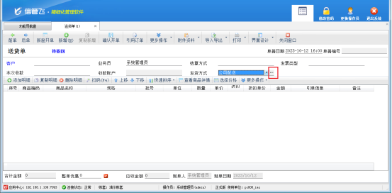 功能導航欄點擊“業務處理”-》“新開送貨單”,進入送貨單開單界面,點擊“發貨方式”后面的圖標,系統彈出“發貨方式維護”窗口,可以進行新增、刪除、導入、導出等操作,維護好之后點擊“保存”按鈕進行保存即可。