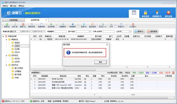 信管飛送貨單軟件通過狀態控制實現簡單的流程管理(待簽回—》已簽回—》已結賬),有用戶在簽回單據時無法簽回,系統彈出提示信息“您沒有簽回單據的權限,請與系統管理員聯系!”,如下圖所示。