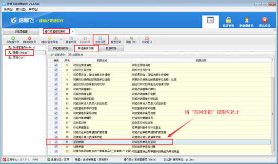 出現此問題的原因是:當前登錄的操作員賬號沒有簽回單據的權限,解決方法如下:使用系統管理員賬號登錄軟件,在功能導航窗點擊“系統管理”—》“操作員及授權”打開操作員管理及授權界面,選擇操作員賬號,在“其他操作權限”界面將“簽回單據”權限勾選上,然后保存權限設置,如下圖所示。