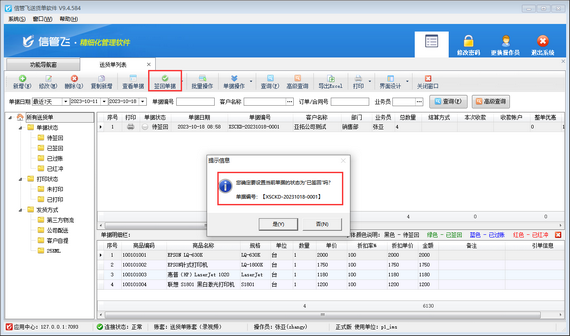 權限設置完成后,使用操作員賬號重新登陸軟件,重新簽回送貨單,即可簽回成功,如下圖所示。