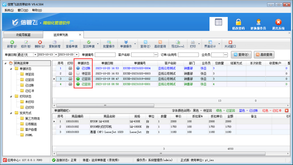 信管飛送貨單軟件通過狀態控制實現簡單的流程管理(待簽回—》已簽回—》已過賬),如下圖所示。本篇文章介紹一下如何設置送貨明細對賬單界面可顯示送貨單“簽回狀態”?