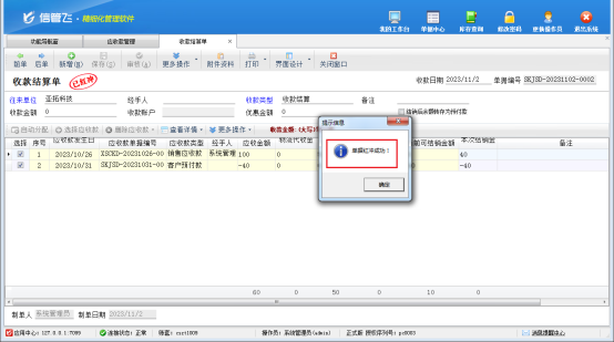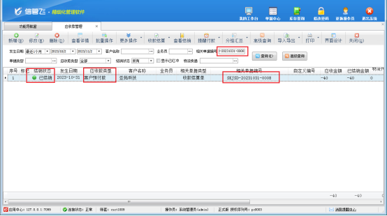 然后,選中此已結(jié)銷的客戶預(yù)付款記錄,在工具欄點(diǎn)擊“查看結(jié)銷”—》“查看結(jié)算單”,打開此客戶預(yù)付款的結(jié)銷記錄,更多操作下將此客戶預(yù)付款結(jié)銷記錄先紅沖后刪除,此時(shí)單據(jù)編號為“SKJSD-20231031-0008”的收款結(jié)算單即可反審修改成功,如下圖所示。