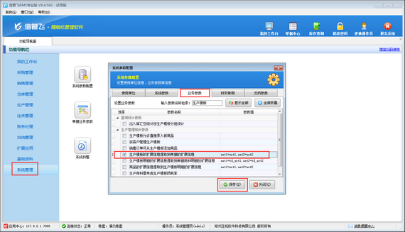 在功能導(dǎo)航窗點(diǎn)擊“系統(tǒng)管理”—》“系統(tǒng)參數(shù)配置”—》“業(yè)務(wù)參數(shù)”打開業(yè)務(wù)參數(shù)配置界面,然后在生產(chǎn)管理相關(guān)參數(shù)中打鉤啟用“生產(chǎn)模板的擴(kuò)展信息提取到單據(jù)的擴(kuò)展信息”參數(shù),參數(shù)值輸入相應(yīng)提取的擴(kuò)展信息編號,如提取擴(kuò)展信息1和擴(kuò)展信息2,則需要輸入“ext1=ext1,ext2=ext2”,用英文的逗號間隔,然后點(diǎn)擊“保存”按鈕保存參數(shù)配置,如下圖所示。