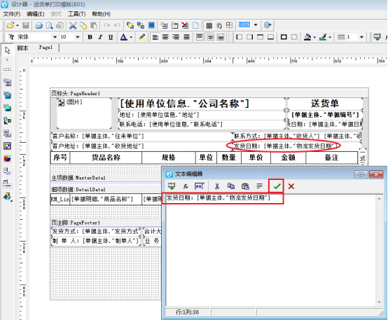 在單據(jù)開單界面選擇打印—》打印格式設(shè)計(jì)—》設(shè)計(jì)格式,進(jìn)入打印模板的設(shè)計(jì)器界面,雙擊發(fā)貨日期文本框,調(diào)用“單據(jù)主體•物流發(fā)貨日期”,如下圖所示: