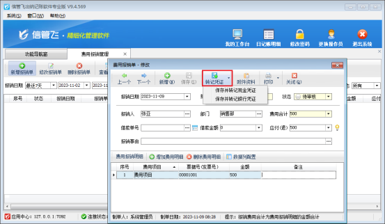 在功能導航窗點擊“綜合管理”—》“費用報銷管理”打開費用報銷管理界面,新增錄入報銷單之后點擊保存按鈕,如圖所示: