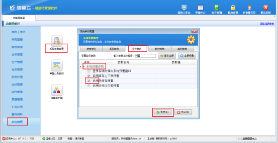 在功能導(dǎo)航窗點擊“系統(tǒng)管理”—》“系統(tǒng)參數(shù)配置”—》“業(yè)務(wù)參數(shù)”,即可進入到“業(yè)務(wù)參數(shù)”配置界面,在系統(tǒng)預(yù)警參數(shù)內(nèi)將“啟用負庫存預(yù)警”參數(shù)勾選啟用,設(shè)置完成后點擊“保存”按鈕保存配置,如下圖所示。