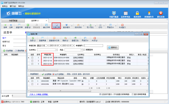 信管飛送貨單軟件新開送貨單支持引用訂單開單,引用訂單如果存在多張,引單窗口會顯示所有記錄,軟件引單窗口默認按降序顯示記錄,最新開的訂單在最上方,如下圖所示: