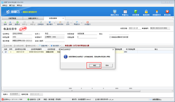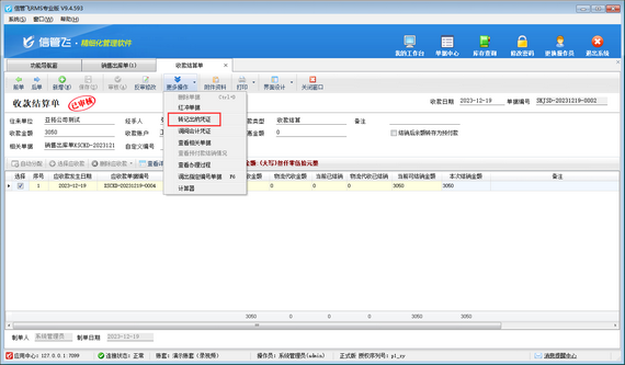 選擇收款結(jié)算單,然后點(diǎn)擊“查看結(jié)算單”按鈕打開(kāi)銷(xiāo)售出庫(kù)單相關(guān)的收款結(jié)算單界面,在收款結(jié)算單界面工具欄點(diǎn)擊“更多操作”—》“轉(zhuǎn)記出納憑證”,在彈出的提示信息窗口點(diǎn)擊“確定”即可打開(kāi)“出納憑證—新增”窗口,核對(duì)憑證信息,保存出納憑證即可,如下圖所示。