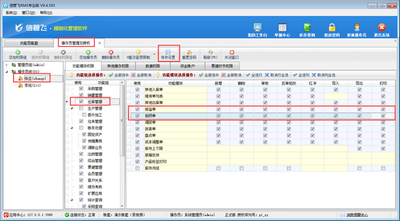 在功能導航窗點擊“系統管理”—》“操作員及授權”打開操作員管理及授權界面,選擇操作員賬號,然后在功能模塊權限內選擇倉庫管理模塊,找到報溢報損單,將報溢報損單的“使用”權限勾選上,以及操作員可使用的其他“新增、刪除”等權限勾選上,然后保存權限設置。