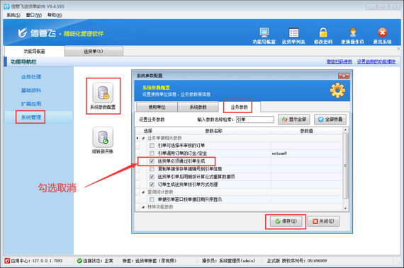 出現此問題的原因是,啟用了參數“送貨單必須通過引單生成”,解決方法如下:使用系統管理員賬號登錄軟件,在功能導航窗點擊“系統管理”—》“系統參數配置”—“業務參數”,找到并勾選取消參數“送貨單必須通過引單生成”,然后保存參數設置,如下圖所示。