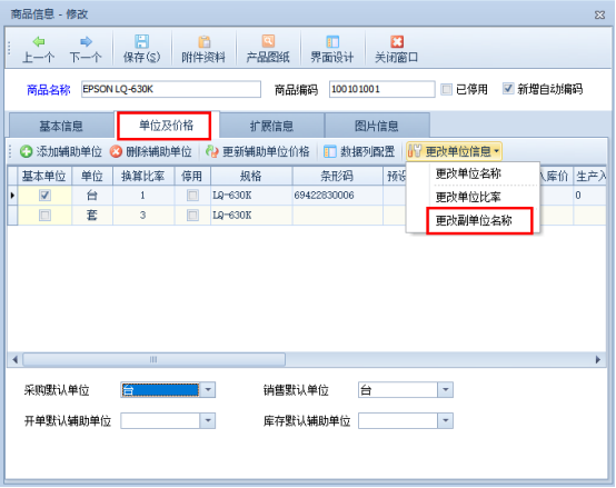 在功能導(dǎo)航窗點擊“基礎(chǔ)資料”—》“商品信息”,在商品信息界面點擊“修改”,點擊“單位及價格”界面。在更改單位信息下點擊“更改副單位名稱”,如下圖所示: