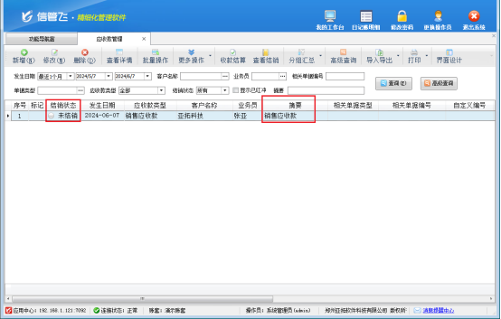功能導航欄點往來管理-》應收款管理,新增一個應收款,摘要可根據實際需求自行進行錄入,信息錄入完成后點擊保存按鈕進行保存,保存后,應收款管理界面增加一條未結銷的銷售應收款記錄。