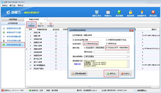 在功能導(dǎo)航窗點(diǎn)擊“系統(tǒng)管理”—》“單據(jù)業(yè)務(wù)參數(shù)”,可進(jìn)入“單據(jù)業(yè)務(wù)參數(shù)設(shè)置”界面,選中“微信消息參數(shù)”,點(diǎn)擊“設(shè)置參數(shù)”,勾選發(fā)送時(shí)間點(diǎn)和接收對(duì)象,然后保存權(quán)限設(shè)置,如下圖所示: