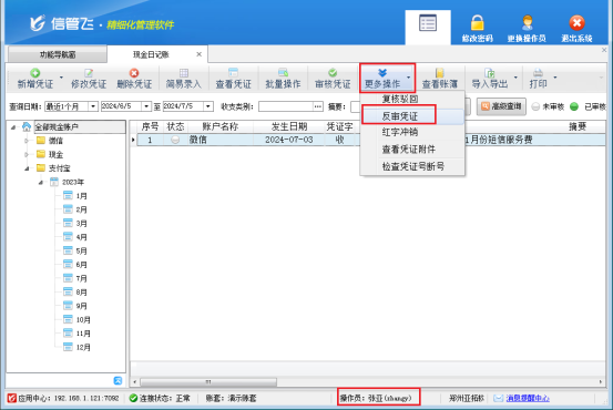 信管飛出納記賬軟件中支持反審憑證,憑證已審核后如發(fā)現(xiàn)填寫錯(cuò)誤,可以反審憑證,反審后,憑證狀態(tài)恢復(fù)為未審核狀態(tài),可以繼續(xù)對這個(gè)憑證進(jìn)行修改操作,然而,部分用戶反饋,在使用操作員賬號(hào)登錄時(shí),可能會(huì)遇到無法對已審核憑證執(zhí)行反審并修改的問題。切換系統(tǒng)管理員登錄,可以正常對憑證進(jìn)行修改,這是由于操作員沒有反審日記賬憑證導(dǎo)致的,本文以“信管飛出納記賬軟件”為例進(jìn)行示范。