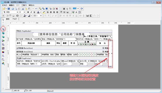 首先進(jìn)入模板設(shè)計器界面(開單界面打印按鈕下點擊打印格式設(shè)計,在打印格式設(shè)計界面選擇模板點擊設(shè)計格式進(jìn)入設(shè)計器界面),點擊左側(cè)工具欄的“插入邊條”,選擇“浮動”位置放到多聯(lián)備注處,包圍備注內(nèi)容,如下圖所示:
