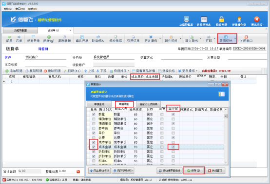 功能導(dǎo)航欄點(diǎn)業(yè)務(wù)處理,新開送貨單,打開送貨單開單界面,工具欄點(diǎn)擊“界面設(shè)計”,選擇單據(jù)明細(xì),勾選顯示“成本單價”“成本金額”數(shù)據(jù)項,并將成本金額后面的“顯示合計”勾選上,然后保存界面設(shè)計。