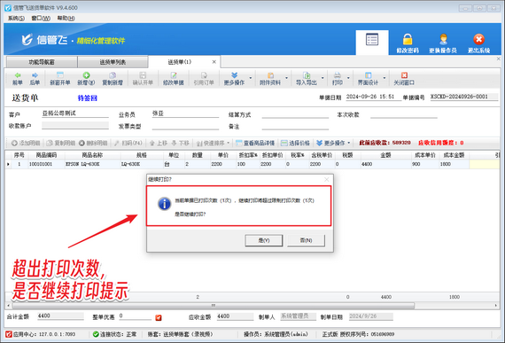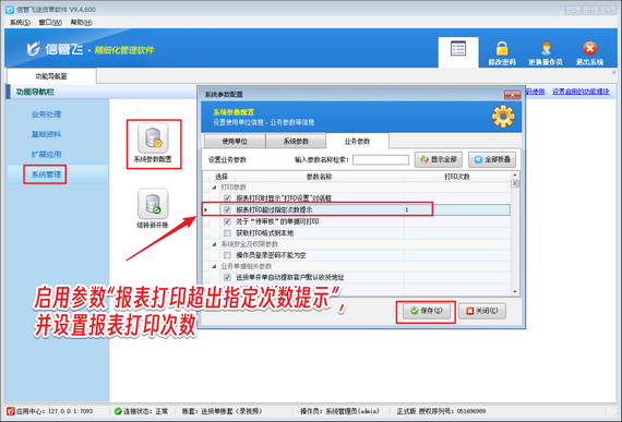 以信管飛送貨單軟件為例,通過簡單設(shè)置,即可實(shí)現(xiàn)操作員打印次數(shù)權(quán)限控制。首先,在系統(tǒng)參數(shù)中設(shè)置打印次數(shù)提示;