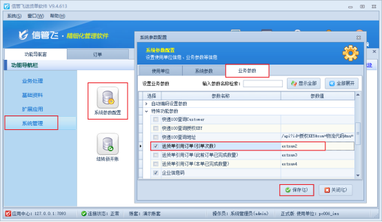 在功能導(dǎo)航窗選擇“系統(tǒng)管理”—》“系統(tǒng)參數(shù)配置”,在業(yè)務(wù)參數(shù)的“特殊功能參數(shù)”中勾選啟用參數(shù)“送貨單引用訂單(引單次數(shù))”,參數(shù)值默認擴展數(shù)值extnum2(可修改其他擴展數(shù)值),保存參數(shù)配置,如下圖所示: