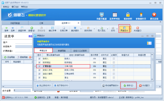 參數(shù)設(shè)置完成后,功能導(dǎo)航窗打開“業(yè)務(wù)處理”—》“新開送貨單”界面,點擊“界面設(shè)計”,單據(jù)主體項對應(yīng)的擴展數(shù)值2勾選上并自定義列名為“引單次數(shù)”如下圖所示: