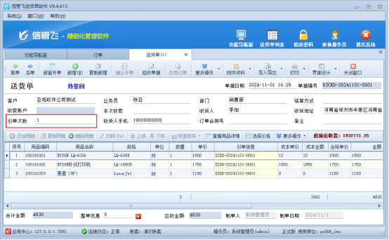 新增送貨單,引用訂單后開單,單據(jù)主體顯示引單次數(shù),如圖所示: