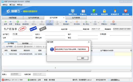 信管飛RMS軟件標(biāo)準(zhǔn)版及專業(yè)版支持?jǐn)U展功能模塊。擴(kuò)展生產(chǎn)管理模塊后,生產(chǎn)任務(wù)單被引用開(kāi)單生產(chǎn)領(lǐng)料單,客戶咨詢領(lǐng)料期間發(fā)現(xiàn)部分庫(kù)存無(wú)貨,只能更改任務(wù)單,在更改部分領(lǐng)料狀態(tài)的生產(chǎn)任務(wù)單時(shí)提示“當(dāng)前任務(wù)單已下達(dá)生產(chǎn)領(lǐng)料出庫(kù)單,不能反審修改”,如何解決?提示如下圖所示: