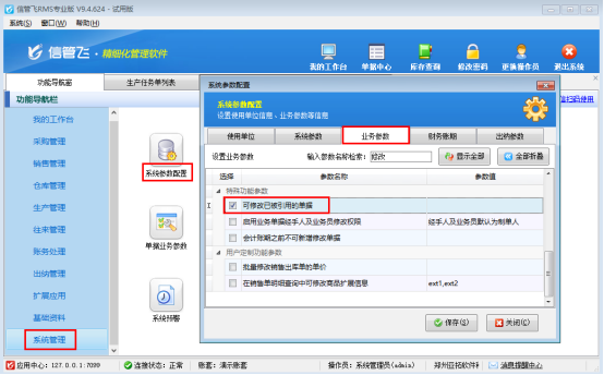 允許反審修改,需啟用下參數(shù),在系統(tǒng)管理-系統(tǒng)參數(shù)配置中選擇“業(yè)務(wù)參數(shù)”,啟用參數(shù)“可修改已被引用的單據(jù)”,保存參數(shù)配置,如下圖所示: