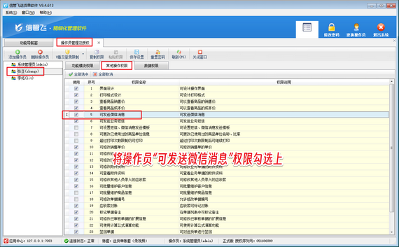出現以上問題的原因是:當前登錄的操作員賬號沒有可發送微信消息的權限