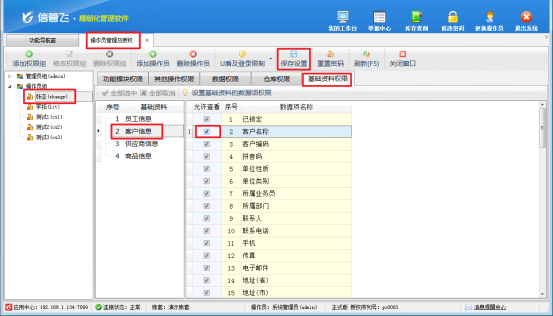 參數配置成功后,用“系統管理員”賬號登錄軟件,在功能導航窗點擊“系統管理”—》“操作員及授權”進入“操作員管理及授權”界面,在權限模塊中可以看到啟用的基礎資料權限,選中操作員“張亞”,點擊“基礎資料權限”,選擇客戶信息,把“客戶名稱”允許查看權限勾選,勾選后保存權限,如圖:
