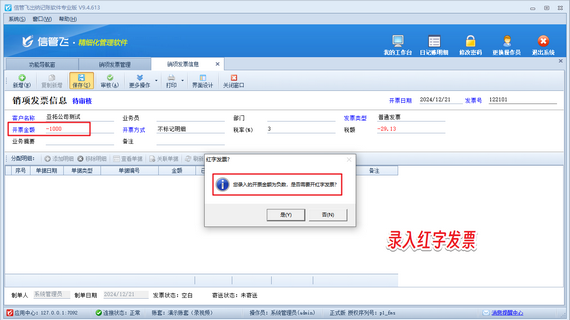 面對紅字發(fā)票的登記難題,信管飛出納記賬軟件提供了簡單明了的解決方案。錄入銷項發(fā)票時,若需開紅字發(fā)票,只需將開票金額設(shè)為負數(shù),系統(tǒng)即刻提示并確認,操作便捷,省時省力。