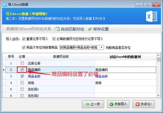 解決方法如下:開單界面點(diǎn)擊“導(dǎo)入導(dǎo)出”-》“從EXCEL導(dǎo)入明細(xì)”重新進(jìn)行導(dǎo)入操作,之后查看軟件設(shè)置的必填項(xiàng),與表格數(shù)據(jù)項(xiàng)進(jìn)行對(duì)照,如圖所示,軟件內(nèi)商品編碼設(shè)置了必須填寫,表格中商品編碼處卻顯示為空,沒有數(shù)據(jù),在軟件中選中商品編碼數(shù)據(jù)項(xiàng),鼠標(biāo)右鍵取消必填標(biāo)志,取消后點(diǎn)開始導(dǎo)入,明細(xì)即可導(dǎo)入成功。
