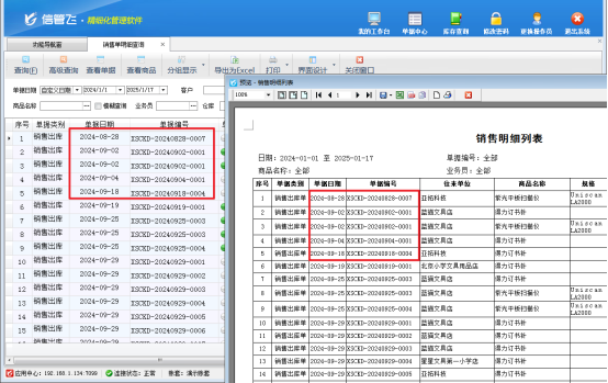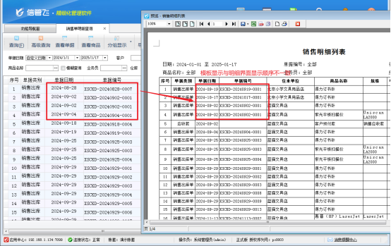 設(shè)置完成后,重新打開(kāi)銷(xiāo)售單明細(xì)查詢界面,此時(shí)打印預(yù)覽界面即可按順序顯示明細(xì),如下圖所示。