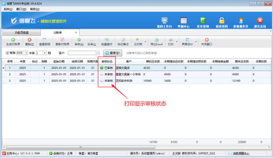 單據審核狀態是指在業務流程中,單據處于審核流程的不同階段所呈現的狀態,它反映了單據處理進展與結果,信管飛RMS開單審核后查詢界面顯示審核狀態,在對賬統計打印時,支持打印單據的審核狀態。