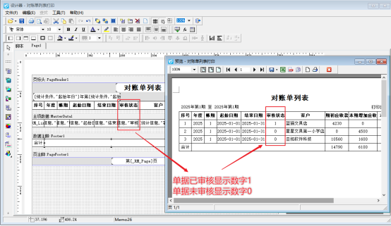 打印對賬單時同樣需要打印“審核狀態”,但是在設計模板時直接調用[統計信息."審核"]數據項,打印預覽對賬單時,審核狀態會顯示為數字,而不是文字內容,如下圖所示。