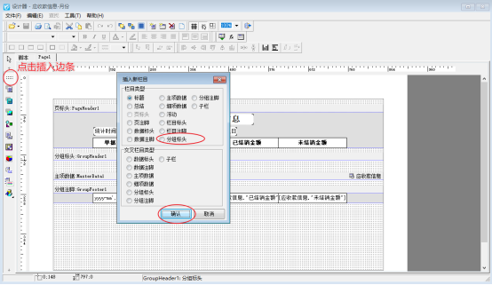 在應收款管理界面點擊打印---打印格式設計,選中模板點擊設計格式;進入模板設計器,在模板設計器界面點擊“插入邊條”,選擇分組標頭,分組標頭高度設置為0,如下圖