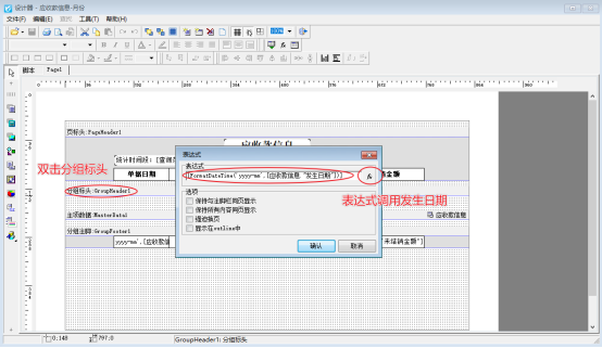 雙擊分組標頭,插入表達式“[FormatDateTime('yyyy-mm',[應收款信息."發生日期"])]”,設置發生日期按照年月統計查詢應收金額總計。