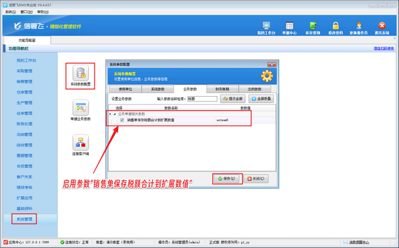 在軟件的功能導航窗中,用戶只需簡單幾步操作,即可啟用并配置“銷售單保存稅額合計到擴展數值”參數。系統默認將該稅額合計值保存到“extnum5(單據主體.擴展數值5)”中,但用戶也可以根據自身需求進行靈活設置。