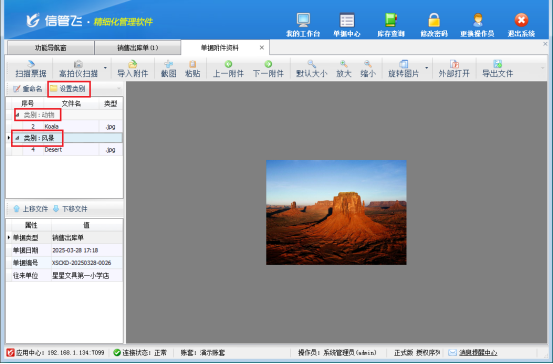 設(shè)置完成后,進(jìn)入銷售管理模塊新開銷售出庫(kù)單并保存后,點(diǎn)擊工具欄上的“附件資料”按鈕,即可進(jìn)入附件管理界面。此時(shí),附件資料窗口上已經(jīng)新增了“設(shè)置類別”按鈕。點(diǎn)擊該按鈕,可以輕松地設(shè)置常用附件資料的類別,讓附件管理更加有序。